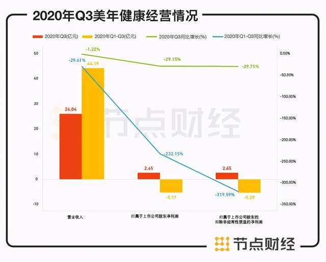 这份三季报显示,2020年前三季度,美年健康的营收与净利均显著下滑——营收44.19亿元,同比降29.61%;净利润为-5.17亿元,同比降232.15%;扣非净利润为-5.29亿元,同比降319.59%。