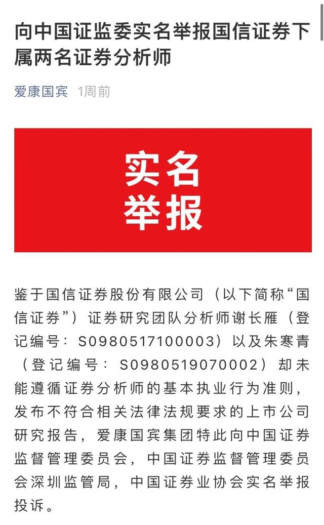 爱康国宾的愤怒可谓“雷霆万钧”。11月8日,爱康国宾向国信证券方面发去了律师函,11月12日,又发布了实名举报公开信,举报撰写该研报的分析师未能审慎核实信息和数据来源,涉嫌传播虚假、不实、误导性信息。