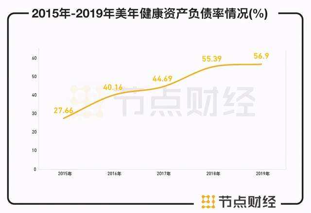 值得注意的是,自上市以后,美年健康的资产负债率一直在快速上升。2015-2019年,美年健康的资产负债率分别为27.66%、40.16%、44.69%、55.39%、56.9%。