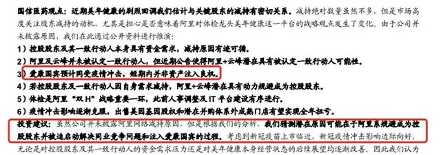11月6日,国信证券发布报告《美年健康:大跌事出有因,探寻阿里战略》。分析师在报告中指出:“虽然公司并未披露阿里网络减持原因,但是根据我们的分析,我们猜测潜在原因可能在于阿里系规避成为控股股东并被迫启动解决同业竞争问题和注入爱康国宾的过程。”