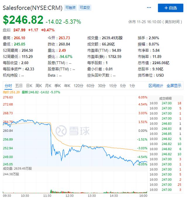 截至目前,Slack盘后股价为39.49美元,市值为232.20亿美元。Salesforce盘后股价为247.99美元,市值为2246.06亿美元。