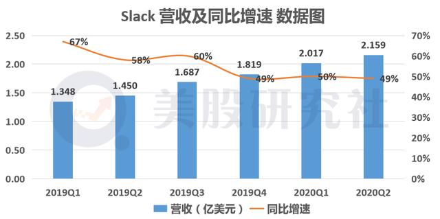 数据显示,Slack今年第二季度的营收为2.16亿美元,同比增长49%。结合连续多季度的营收情况,可以发现虽然收入规模在不断扩大,但是同比增速确呈现出缓慢下降的趋势。