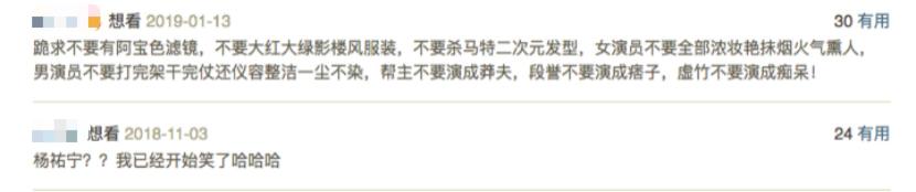 《天龙八部》的评分也是一落千丈,最佳版本是1997年黄日华版,成为了许多80后观众的童年回忆。2003年大陆拍摄的胡军版也深入人心,无论是内容制作还是演员的演技都无可挑剔,甚至现在还有人叫胡军“乔峰”,可见这一角色的观众缘。而2013年钟汉良主演的版本评分只有4.5,再看演员阵容根本无法与2003年版本相提并论,虽然画面更加华丽,但过于迎合市场以及偶像化倾向也削弱了金庸原著的深层内核。目前,杨祐宁和文咏珊主演的《天龙八部》还未播出,从“想看”的评论里已经可以读解出网友们的担忧。