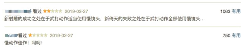 无独有偶,《倚天屠龙记》的改编也同样遇到了这样的问题。2001香港版的《倚天剑屠龙刀》和2003台湾版的《倚天屠龙记》评分都在8.0以上,但2009年邓超版就出现了滑铁卢,豆瓣评分5.3,网友的评价大部分都是诟病武打动作烂、演员演技尴尬以及颜值等问题。等到2019年曾舜晞版仍然不尽人意,网友们的评价与邓超版差异不大,很多都在厌恶大陆剧中惯常使用的武打慢镜头。