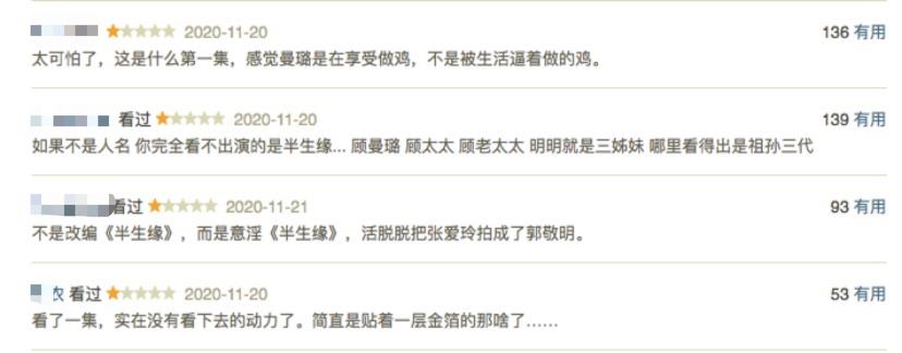 这也不难理解,为何《半生缘》重新改编后遇到了审查难、播出难的问题。虽然改名《情深缘起》后低调播出,豆瓣也并未开分,但从网友们的评分可见,一星党还是非常多的。