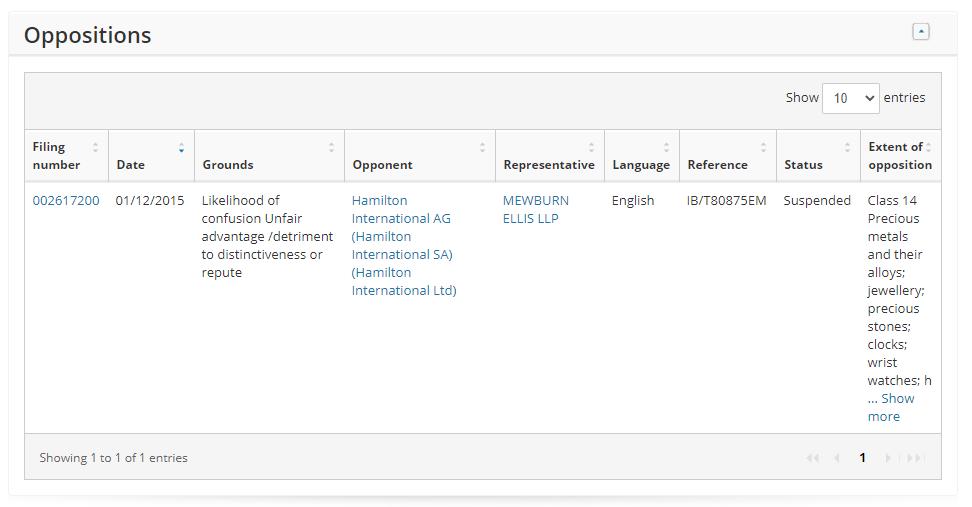 当然,细心的你可能发现了,有一件“LEWIS HAMILTON”的商标被提了异议。这个异议申请人,正是汉密尔顿手表,异议时间是2015年12月。