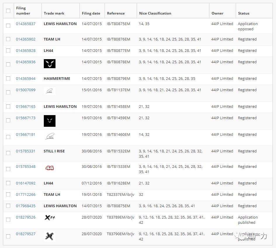 ▲ 汉密尔顿名下44IP申请注册的欧盟商标(来源:EUIPO)
