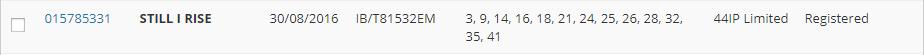 ▲ 汉密尔顿名下44IP申请注册的“STILL I RISE”欧盟商标信息(来源:EUIPO)