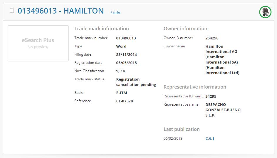先来看看这件由汉密尔顿手表申请的“HAMILTON”商标。据了解,这是一件申请于2014年11月、获准注册于2015年5月的欧盟文字商标,使用在第9类商品(包括各种电子设备)和第14类商品(包括贵金属、手表等)上,商标号13496013。