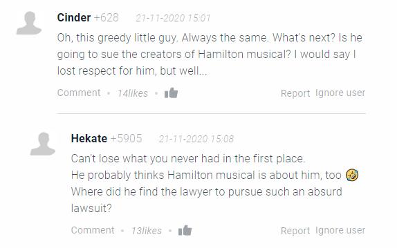 - 哦,这贪婪的小伙子。总是这样。下次呢?起诉《汉密尔顿》音乐剧(笔者注:2015年首演的一部百老汇音乐剧)?我得说我已经对他失望了,不过无所谓了……