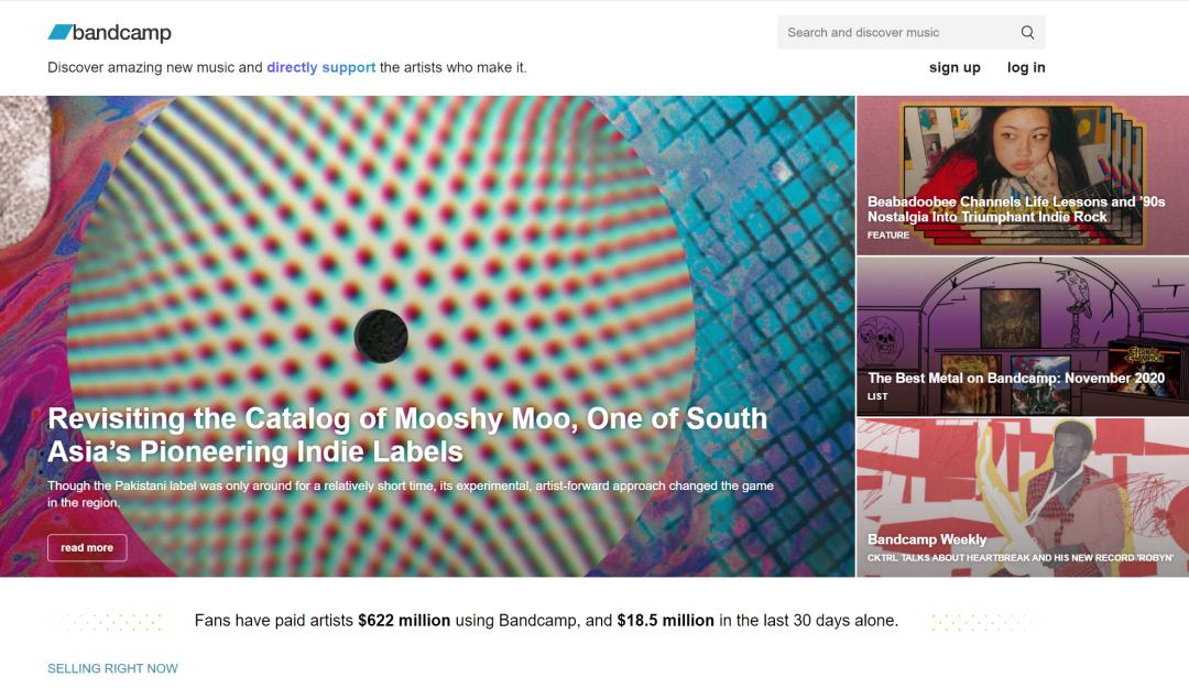 诞生于2008年的Bandcamp是一个全球音乐社区,从最初以线上数字版音乐为主的平台,到今天已发展成了各类音乐人周边售卖的主要平台。在这里,粉丝可以发现音乐,并支持创作音乐的艺术家。音乐人和唱片公司可以将音乐上传到Bandcamp并控制购买方式、价格,并且粉丝可以选择自愿支付比标价更多的钱。据悉,不管用户在Bandcamp平台购买包括数字音乐、唱片、周边T恤、门票或磁带等等在内的任意商品,最终80%-85%的收益都会以当日结算的形式付给音乐人。而据Bandcamp的页面显示,自诞生以来,该平台已为音乐人创造了6.22亿美元的收入。