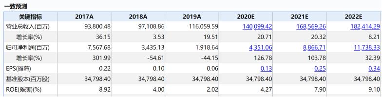 因此市场开始畅想竞争格局改善后带来盈利能力的提升,尤其是在明年供需关系仍然相对紧张的背景下,毕竟双寡头是最为让人喜欢的竞争格局。市场预期双雄2020-2022年都将呈现高速的业绩增长,比如万得一致预期显示京东方2020和2021的净利润增速将分别高达127%和104%。