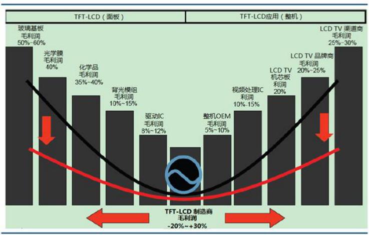 日韩退出的只是价值量最低的环节。LCD产业链上、中、下游行业的毛利率水平构成了著名的“微笑曲线”,曲线左边是上游的玻璃基板、光学膜材、化学品和背光模组等相关供应商,曲线中间是液晶面板及模组制造厂商,曲线右边是下游整机组装、整机品牌商和渠道经销商。显然国内的面板双雄所处的就是价值量最低的环节,毛利率高点也在30%以内。
