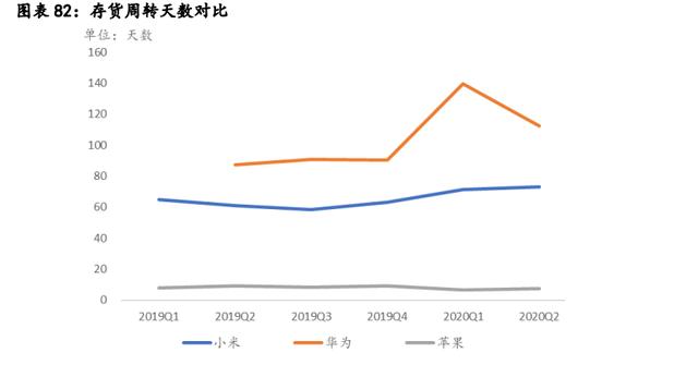 2019年至今,小米的存货周转天数在70天左右,苹果在10天以内,而华为受限于美国制裁,不得不加大采购量应对,导致存货周转天数在2019年Q4-2020年Q1迅速拉长,正常情况下在80天左右。