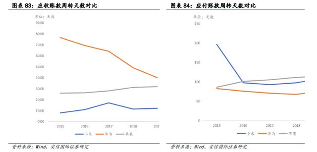 而在应付账款周转天数上,小米目前徘徊在100天左右,华为为70 天左右,而苹果为105 天左右。