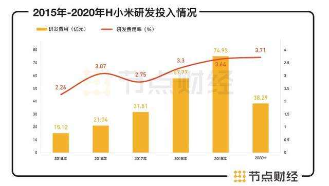 用数据佐证,公司研发费用从2016年的21.04亿元到2017年的31.51亿元,再到2018年的57.77亿元和2019年的74.93亿元,每年的增长率分别达到52.38%、81.25%和29.31%。2020年上半年,小米的研发投入为38.29亿元,同比增速达19.4%,研发费用率3.71%。