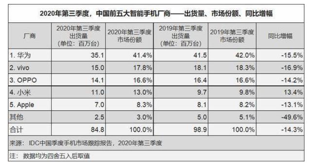 IDC数据显示,华为三季度以3510万台出货量稳居国内手机市场第一位,市场份额41.4%,位列第四的小米出货量为1100万台,市场份额13%。照此计算,小米手机国内出货量的贡献度只有23.6%。