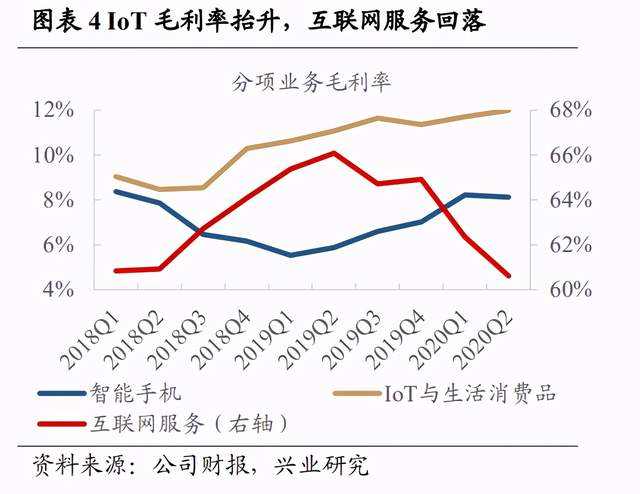 同时,手机业务占比从去年同期的60%大幅提升至66%,环比上季度提升6.9%;IOT营收占比则从去年同期29%降至22%,增幅亦从超过40%降至20%以下;互联网服务收入同比增幅从去年12.8%降至8.7%,营收占比也从去年9.9%降至8%。