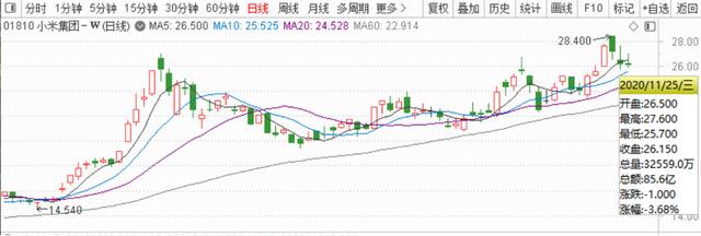 然而,次日小米的股价并没有表现出相应的自信,反而大跌3.68%,盘中一度跌逾5%,报收于26.15港元。