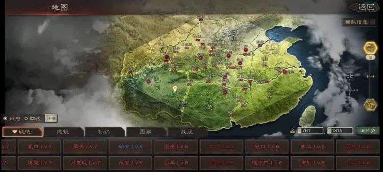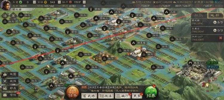 当玩家第一次登录,系统会询问倾向的地域,玩家需要在西凉、关中、巴蜀、山东等九块版图中选择一个,随后就会对应得到一座城市。之后可以跟随引导任务的要求,开始在城池里发展内政和军事。建设所需的石料、木材等发展物料要靠占领城池周围的田地、矿场来获得。随着武将的积累和带兵数上限的上升,可以攻下的土地级别也越来越高,城池周边频频出现的蛮军也能作为玩家提升武将的饲料。