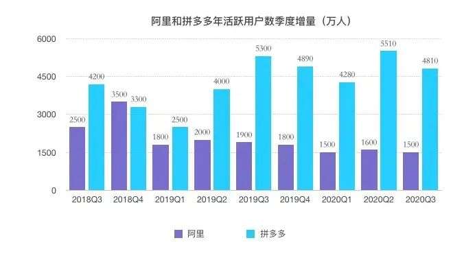 (阿里和拼多多年活跃用户数季度增量对比:2018Q3—2020Q3,制图:DoNews)
