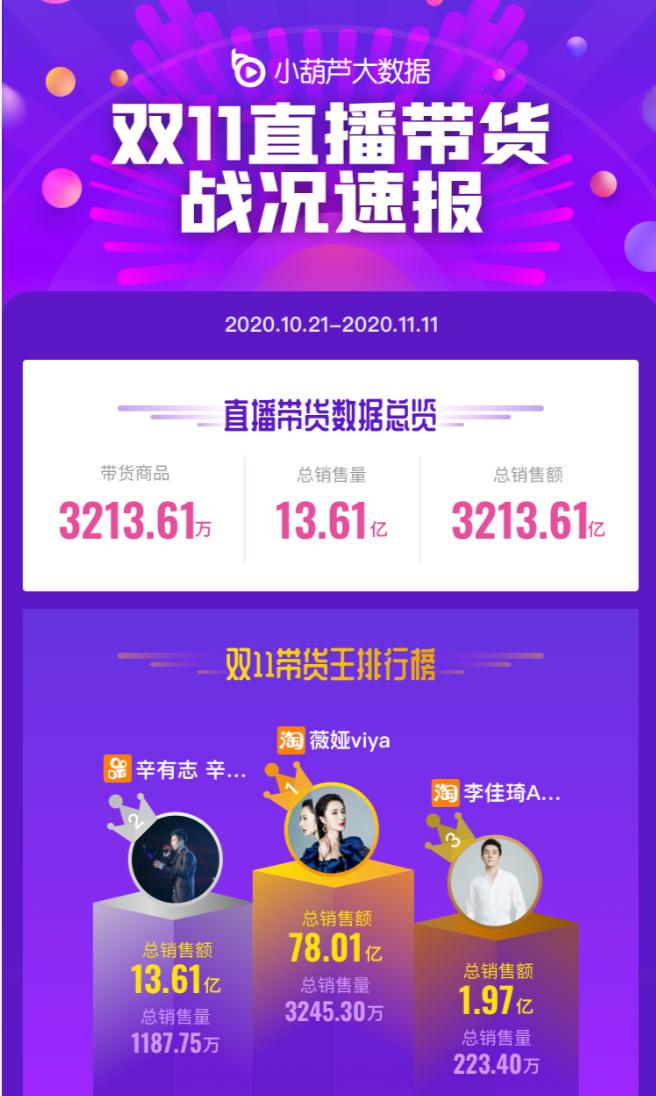 2020年双11带货王排行榜(数据来源:小葫芦)