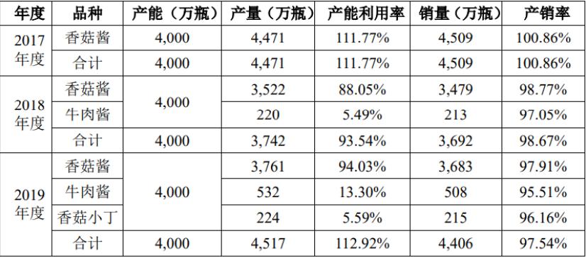 香菇酱系列已连续三年产销率下滑,从2017年的100.86%降至2019年的97.54%。
