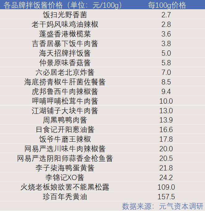 最重要的是,拌饭酱的毛利率及行业天花板非常高,在一定范围内,消费者对价格不太敏感。根据元气资本调研数据,拌饭酱市场价格差异非常大,从每100克单价2.7元的菌菇酱至最高150元/100g的秃黄油都有分布。而较早进入拌饭酱市场的品牌产品定价多集中在每100克6元以下,更高价的市场仍然有很大的空间,这也是跨界进入这一领域的非调味料品牌瞄准的价格区间。