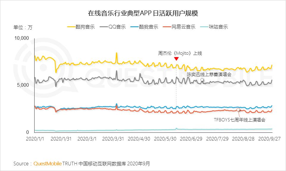 而在Questmobile在近期发布的《2020中国移动互联网秋季大报告》中,我们甚至都没有看到虾米音乐的身影,背靠中国移动资源的咪咕音乐代替了虾米音乐纳入了统计口径。可以推测出,相较两年前,虾米音乐活跃总量依然不温不火,距离前四大平台有着相当的差距,甚至可能都不如咪咕音乐。