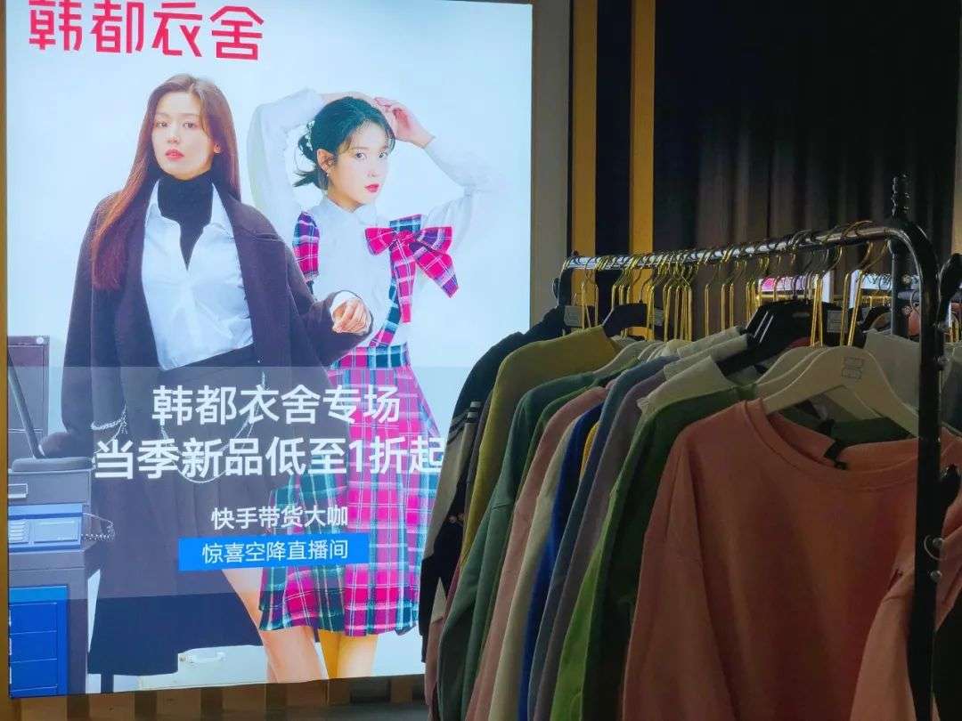 直播间被布置得如同一家线下门店,暖黄灯光下,羽绒服、毛呢外套、卫衣、毛衣等服饰分类挂放在四周,其中有不少是往季的款式。中央的巨型灯箱上挂着“韩都衣舍”的LOGO与两位品牌代言人——韩星全智贤和IU李智恩。