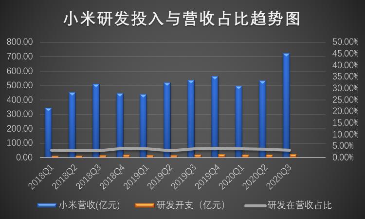 在最能代表公司技术本心的研发投入上,小米三季度研发投入23亿元,占总收入3.2%,比去年同期的3.7%还要低。实际上,过去两年里,小米在研发投入并不多,在过去八个季度,小米的研发投入在总营收中的占比始终控制在3%-4%之间。对比华为2019年花在研发上的1317亿元,且在总营收中占比超过15%的力度,小米显得实在相形见绌。