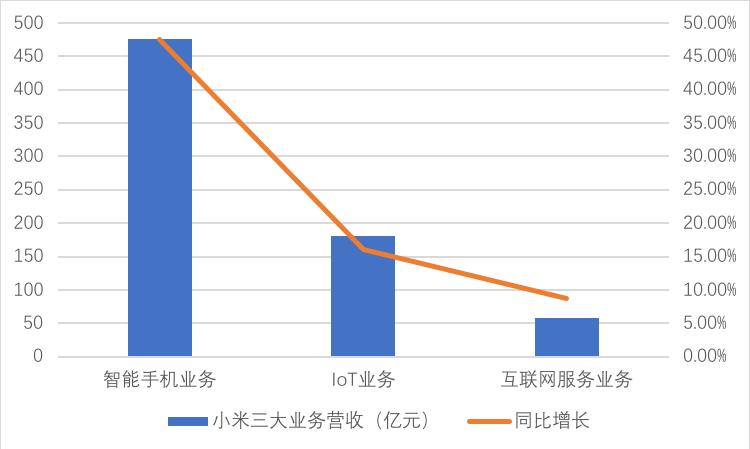 目前,小米三大业务版图,由智能手机、IoT与生活消费产品、互联网服务组成,这三项业务三季度的收入分别为476亿元、181亿元、58亿元,同比分别增长47.5%、16.1%、8.7%,在总营收占比分别为66.0%、25.1%、8%。