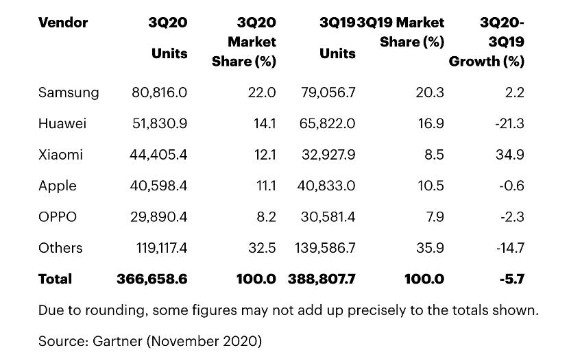据Gartner数据:到2020年第三季度,全球智能手机总销量为3.66亿部,同比下降5.7%;全球手机销量则同比下降8.7%至4.01亿部。三星以8080万的销售量排名世界第一,市场占比达22%;华为则同比从6580万部跌至5180万部。