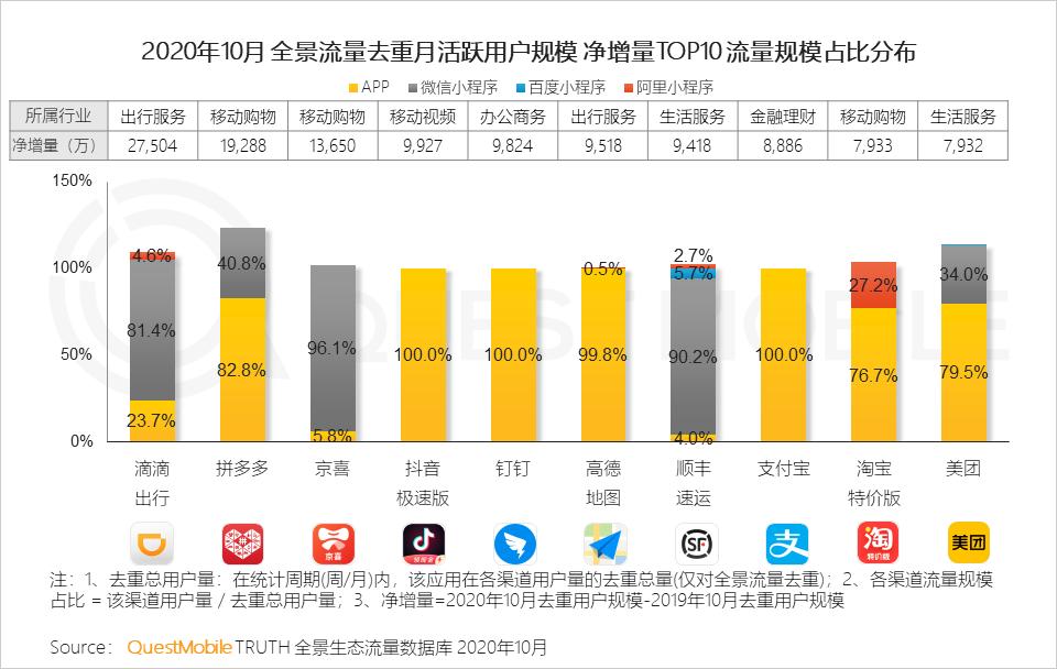1.1 全景生态布局下赋予各类应用新的活力,净增量TOP10应用中,近半数主要流量来源于小程序