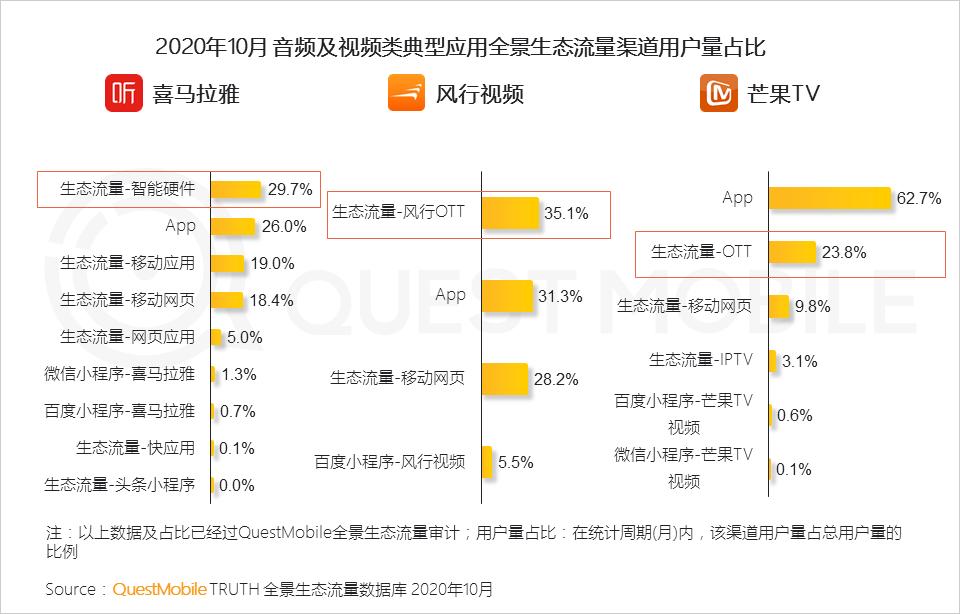 1.3 音频及视频类应用除布局小程序外,同时加快生态内多流量渠道的构建,喜马拉雅智能硬件生态流量、风行视频OTT生态流量均已超越APP,成为主要流量来源渠道