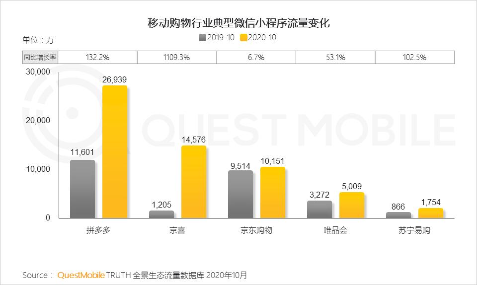 小程序流量加持下,移动购物行业头部应用流量差距逐渐缩小,拼多多、京东、唯品会及苏宁易购等从社交场景收获流量效果显著,拼团、砍价等玩法在社交裂变下持续发挥引流获客的重要作用