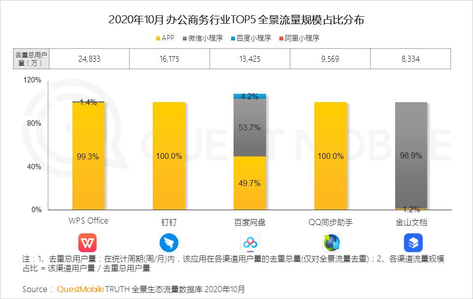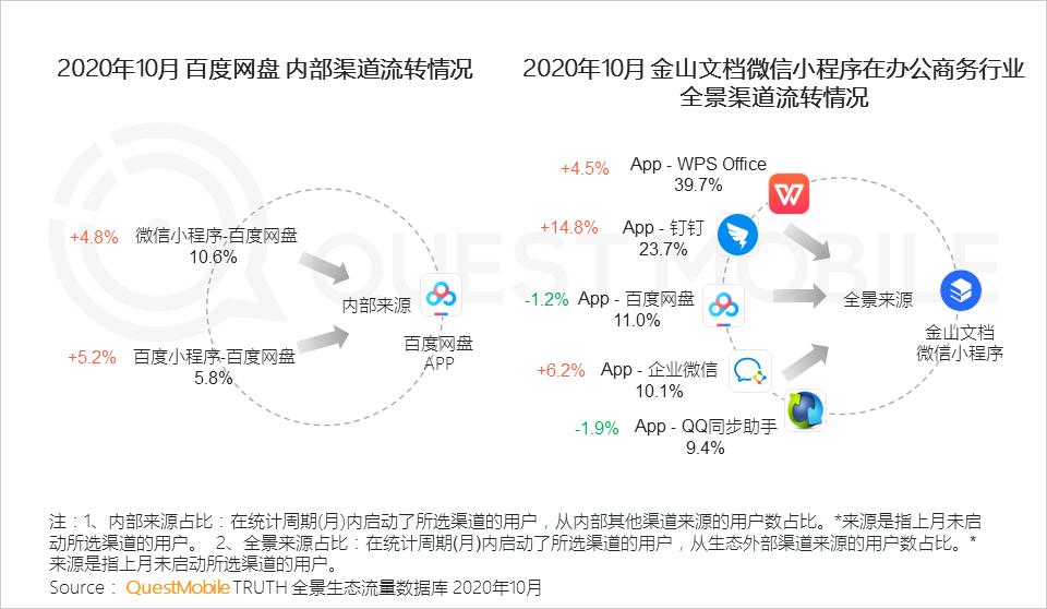 办公商务行业加深渠道用户流转,百度网盘小程序引流APP效果提升明显,金山文档微信小程序生态外部渠道流量收获颇丰