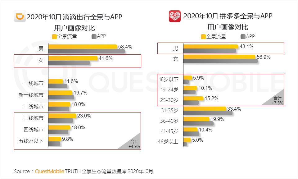 1.2 全景流量为APP补充用户来源,实现对更多用户的覆盖,全景流量下滴滴出行收获更多女性及下沉市场用户,拼多多实现对30岁以下年轻用户的补充