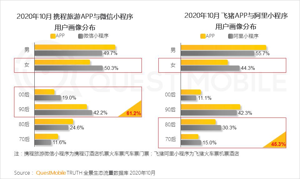 5.2 小程序助力旅游服务类应用实现更多元人群的覆盖,微信小程序为携程旅游带来更多年轻女性用户,阿里小程序帮助飞猪实现对70、80后人群的扩充