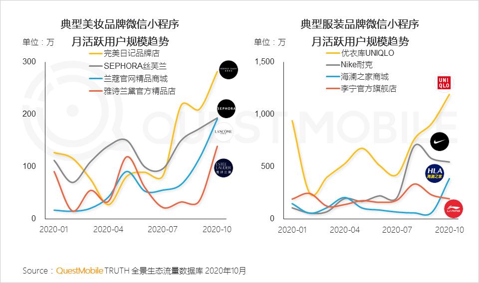 2.2 美妆、服装等品牌陆续上线小程序,结合微信小程序平台公众号、小程序直播等多渠道搭建私域流量