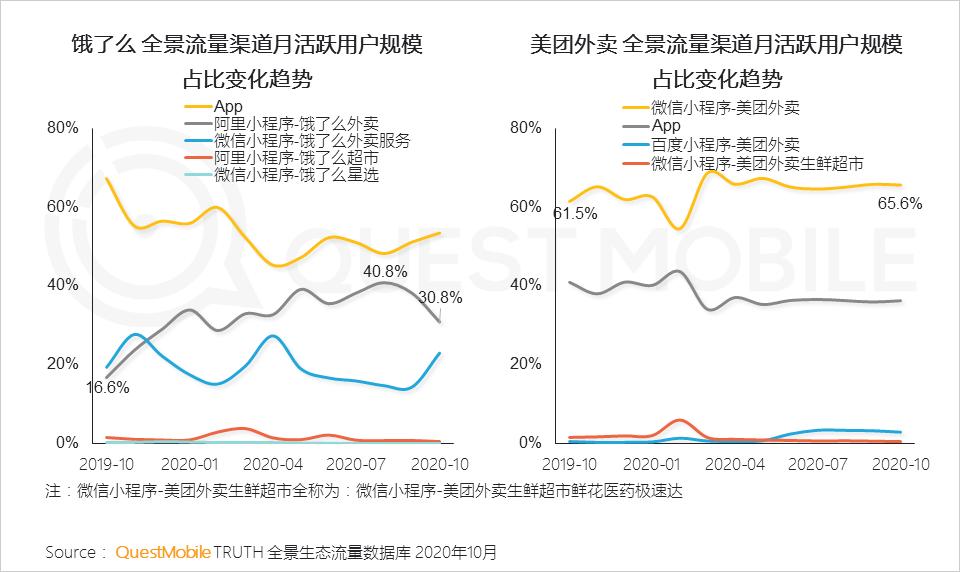 3.2 外卖平台全景布局加深多场景用户触达,饿了么外卖阿里小程序流量占比峰值超越四成,美团外卖微信小程序流量成为其主要渠道