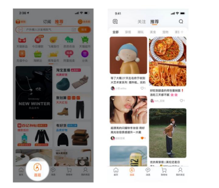 淘宝新版本中,逛逛分为左右两区,点击“逛逛”tab,默认进入右侧的“推荐”区,即达人、普通用户、商家可分享内容的区域,以双列信息流展示,点击内容页面,可进入单列滑动模式。在逛逛内发布内容,可选择添加商品链接,也可不带任何链接。