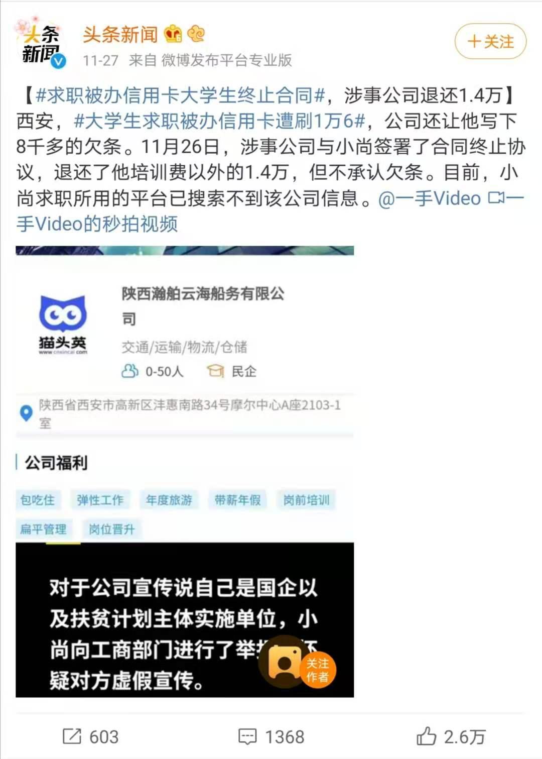 今年11月27日,西安大学毕业生小尚求职被办信用卡的事情就曾登上微博热搜。在这次事件中,小尚被应聘单位办了两张信用卡,而且单位不仅从卡里刷走了1.6万元,还要求小尚写下了一张8000多元的欠条。而在这之前,该公司承诺的却是除了9800元的培训费用由公司垫付之外,另不收取其他费用。
