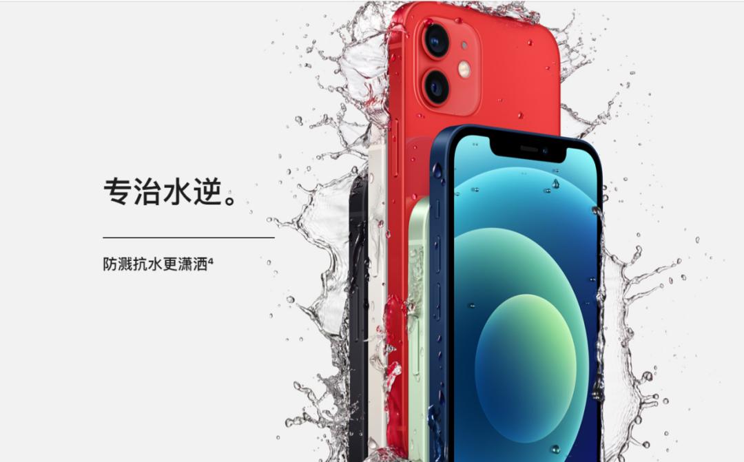 在苹果中国区官网上,抗水性能被作为iPhone12的主要卖点进行宣传。苹果官方称,iPhone 12 和 iPhone 12 mini 可防溅、抗水、防尘,在受控实验室条件下经测试,其效果在IEC 60529 标准下达到 IP68 级别 (在最深 6 米的水下停留时间最长可达 30 分钟)。在介绍了具体的性能后,苹果还不忘附上一句“由于浸入液体而导致的损坏,不在保修范围之内。”