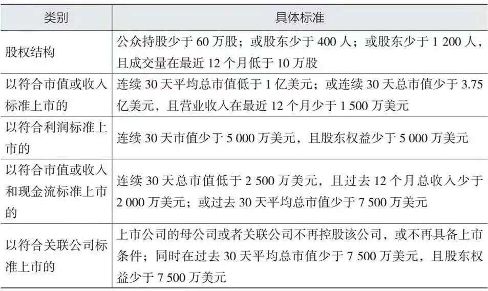 中国证监会原主席肖钢的《中国资本市场变革》一书中提到,美国纽交所每年大致有130家上市公司退市,年平均退市率约为6%。此外,书中还介绍了纽交所的一些退市细则,包括量化指标和非量化指标两个层面,具体细节见下图: