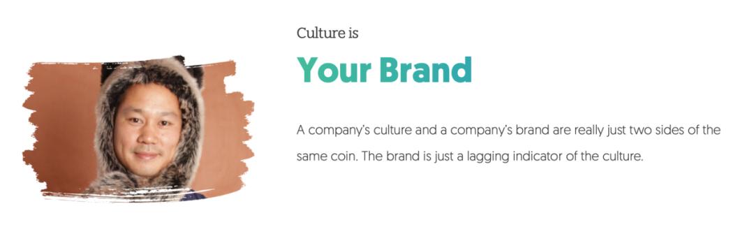 在Zappos,他们的信仰是,如果树立了正确的企业文化,大部分其它的东西——诸如最好的客户服务,建立长期品牌,充满激情的员工和顾客——就都会自然而然地发生了。谢家华的这一句话经常会我在提案里被引用,“一个公司的文化和品牌其实就像是一枚硬币的正反面。品牌只是反映公司文化的滞后指标,但是最终二者将会并驾齐驱。你的文化就是你的品牌。”
