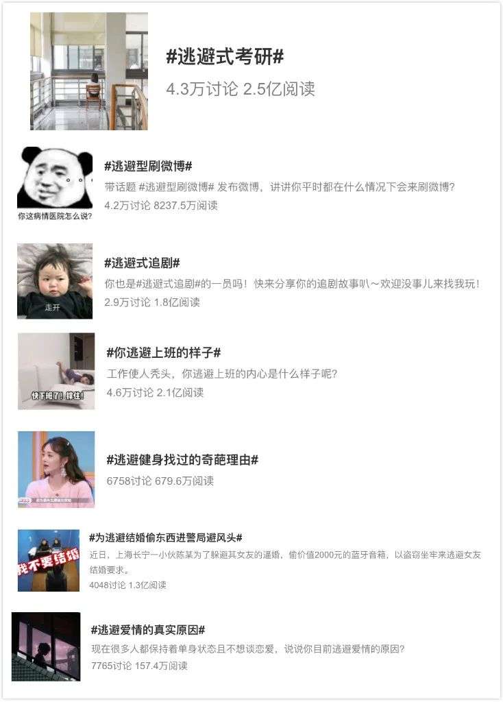 在社交媒体上,有关“逃避”的话题隔三差五就会冒出来,因为不想踏入社会而选择考研、因为不想健身而选择加班、因为害怕两性关系中的麻烦或失败而选择单身……