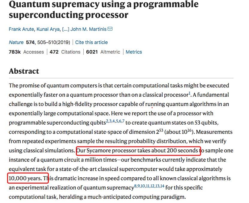 去年,谷歌利用「随机线路采样」这一特定任务实现了所谓的量子霸权。在世界第一超算 Summit 需要计算 1 万年的实验中,谷歌的量子计算机只用了 200 秒。这一论文被发表在Nature上: