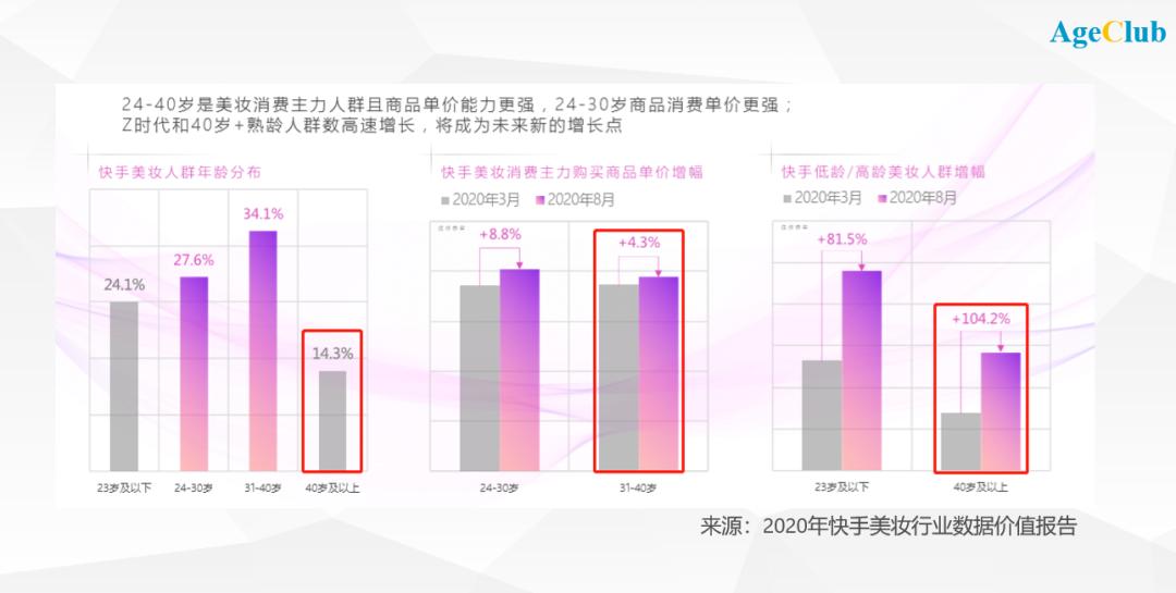 AgeClub结合短视频平台中的数据和案例来看,中老年KOL带货商品以国货为主,护肤类产品所占比例最多,美妆品类在逐渐丰富,身体护理类产品也越来越多。快手美妆报告也显示,未来40岁+熟龄人群将是未来新的增长点。