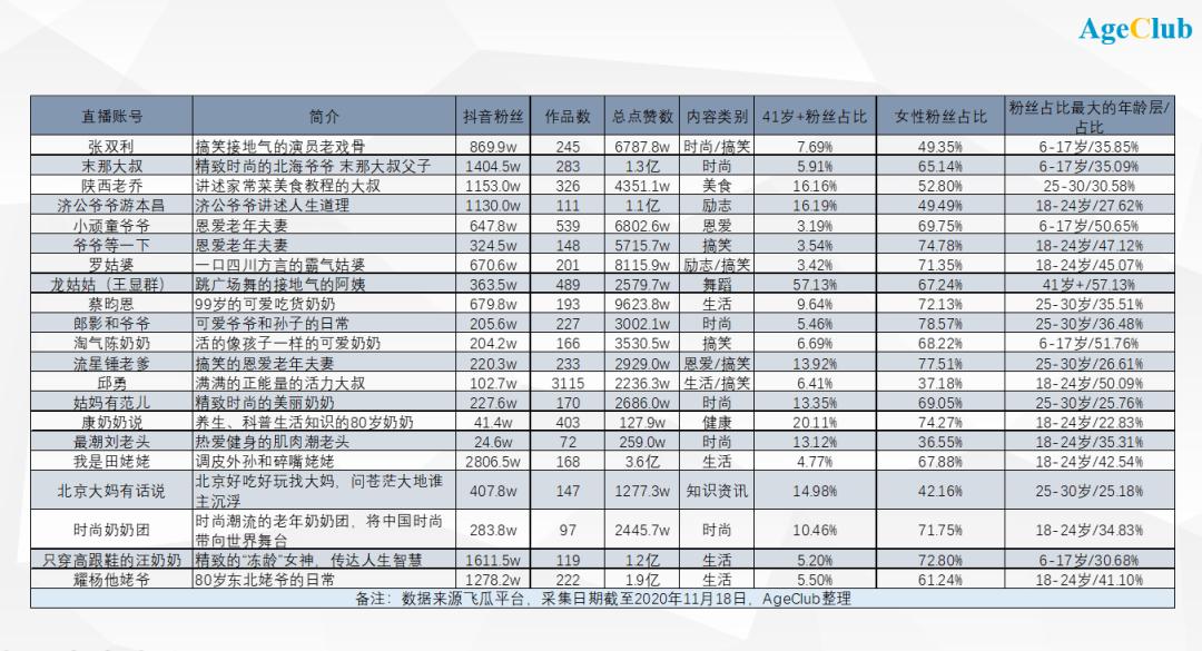 AgeClub不完全统计,仅在抖音走红的中老年网红就超过30位,且不少已成为千万粉丝的头部KOL,例如“我是田姥姥”粉丝量直逼3000万。